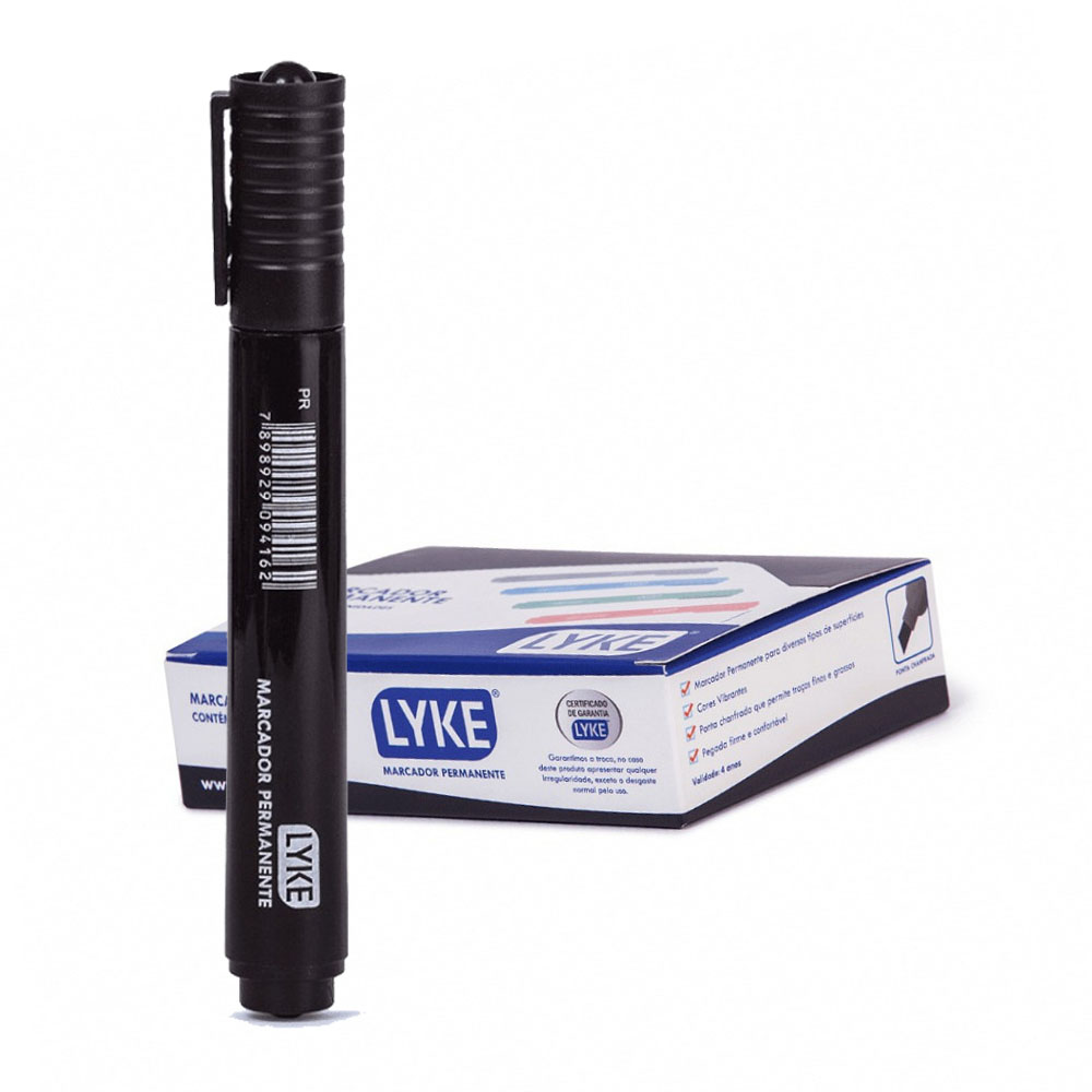 Marcador Permanente LYKE, na cor Preto, pode ser usado para diversos tipos de superfícies lisas, sua tinta é permanente e sua ponta chanfrada.
